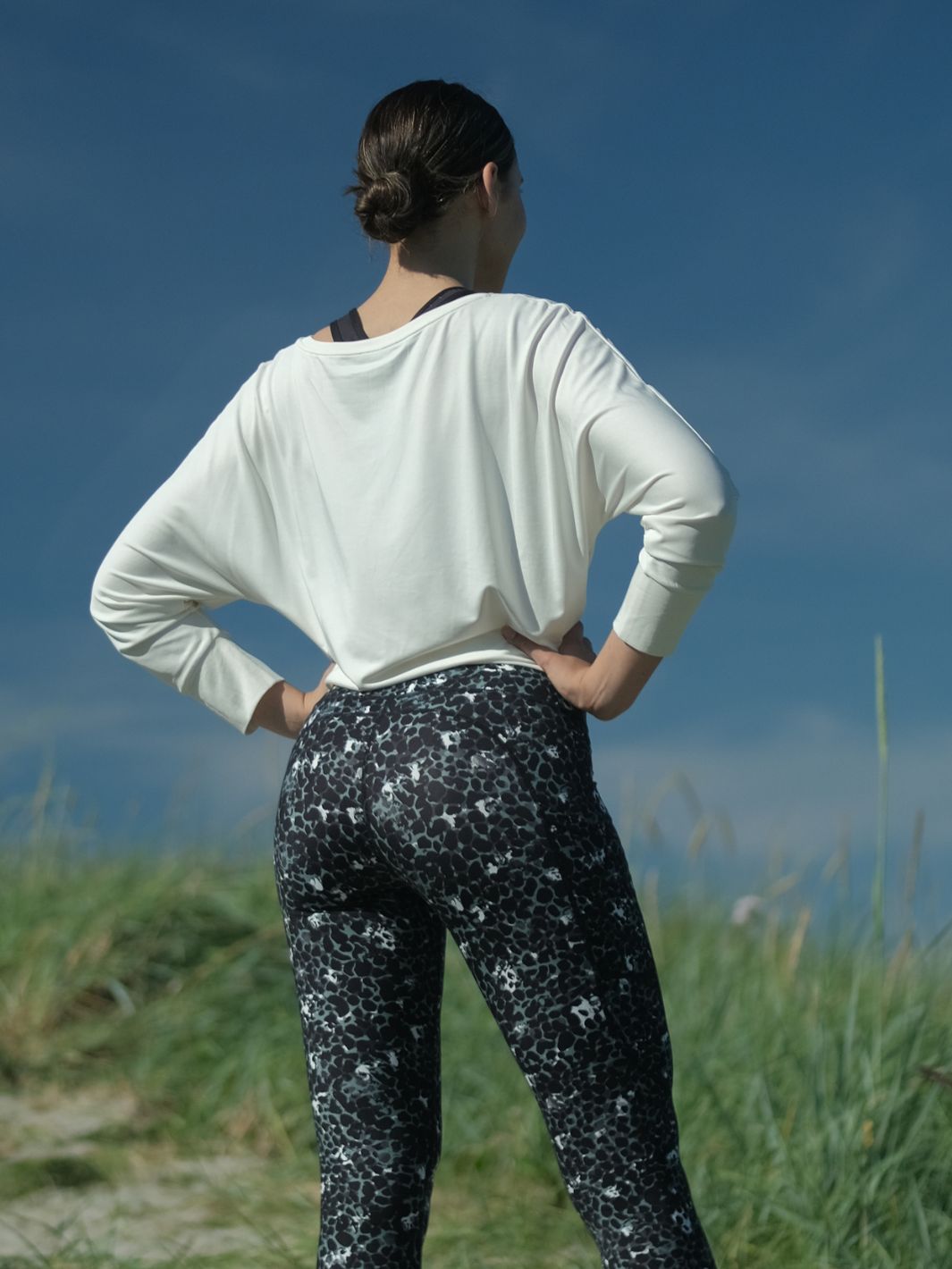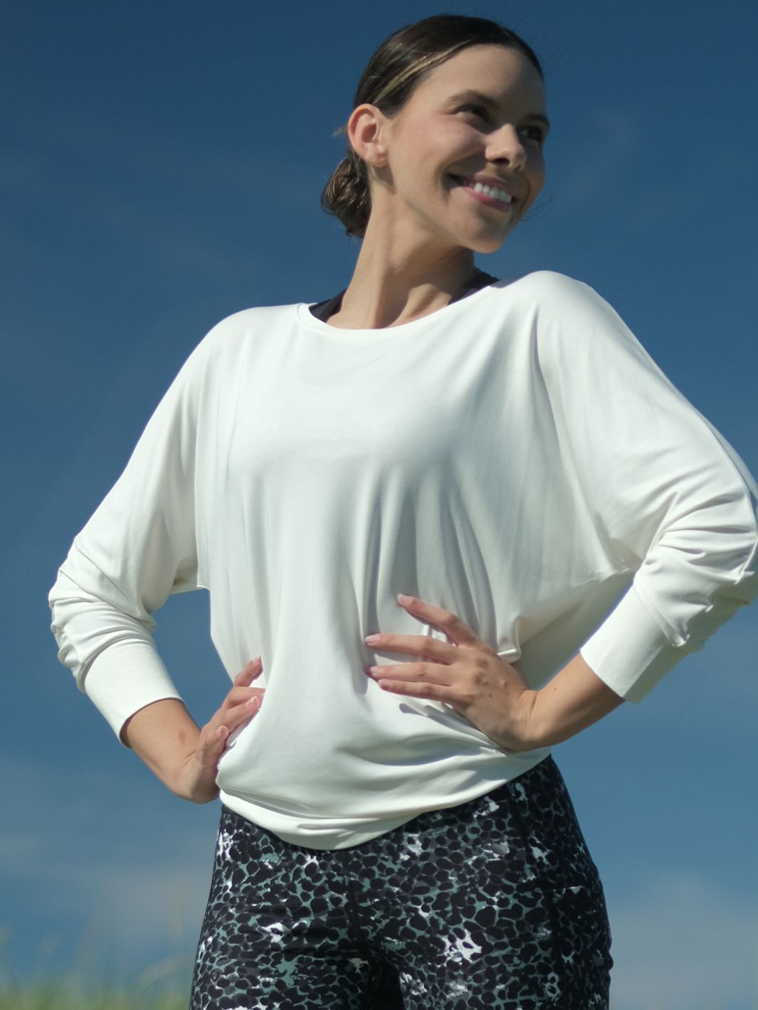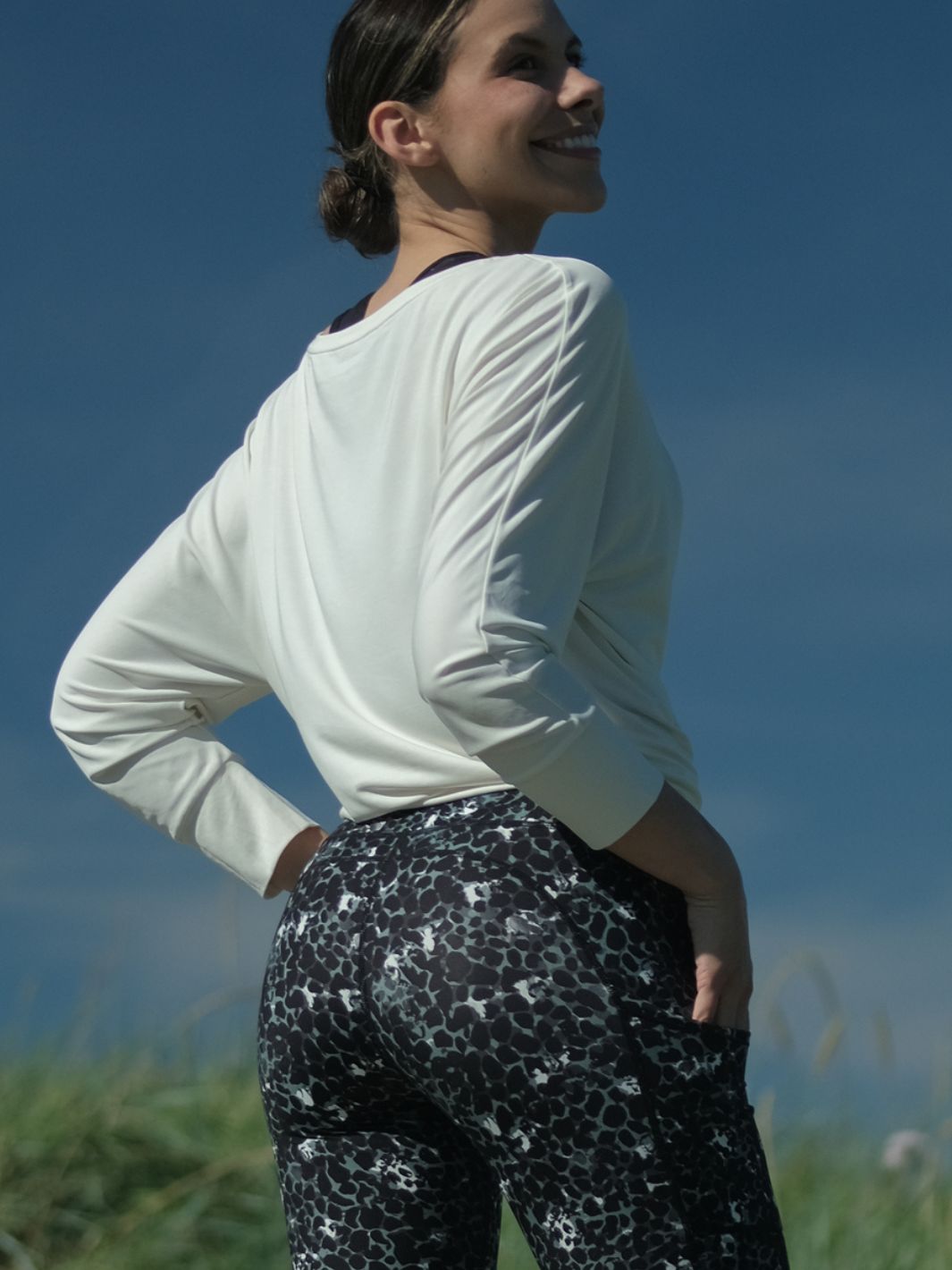 Skön tröja i lös passform men ändå smickrande i snittet. Tillverkad av naturmaterial + träningsmaterial, en mix av bland annat modal, som är väldigt skön att använda i varma miljöer, t.ex. vid träning. Lite längre bak än fram, med 3/4 ärm som faller fint. Normal men något rymlig i storleken
