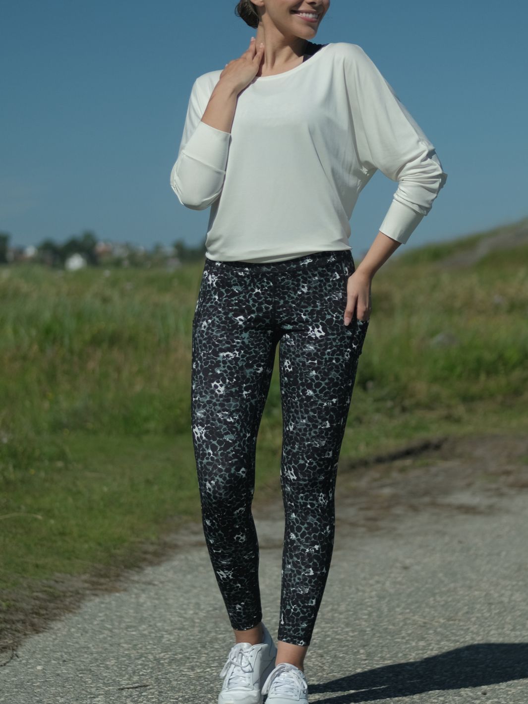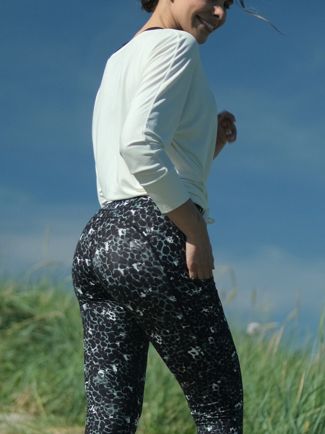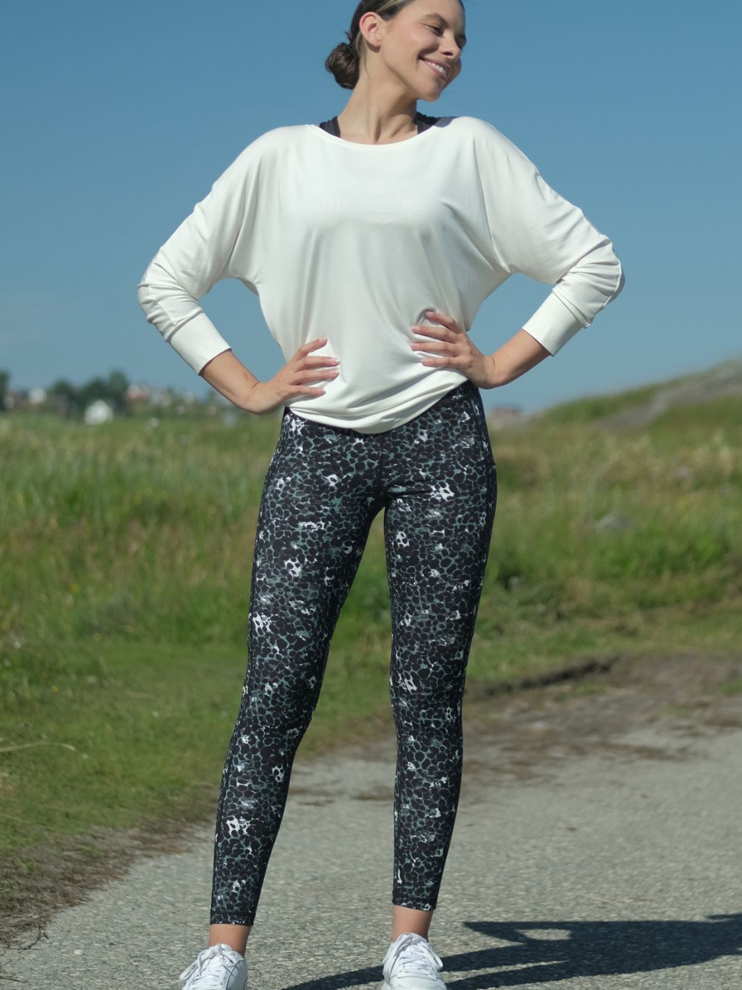 Skön tröja i lös passform men ändå smickrande i snittet. Tillverkad av naturmaterial + träningsmaterial, en mix av bland annat modal, som är väldigt skön att använda i varma miljöer, t.ex. vid träning. Lite längre bak än fram, med 3/4 ärm som faller fint. Normal men något rymlig i storleken