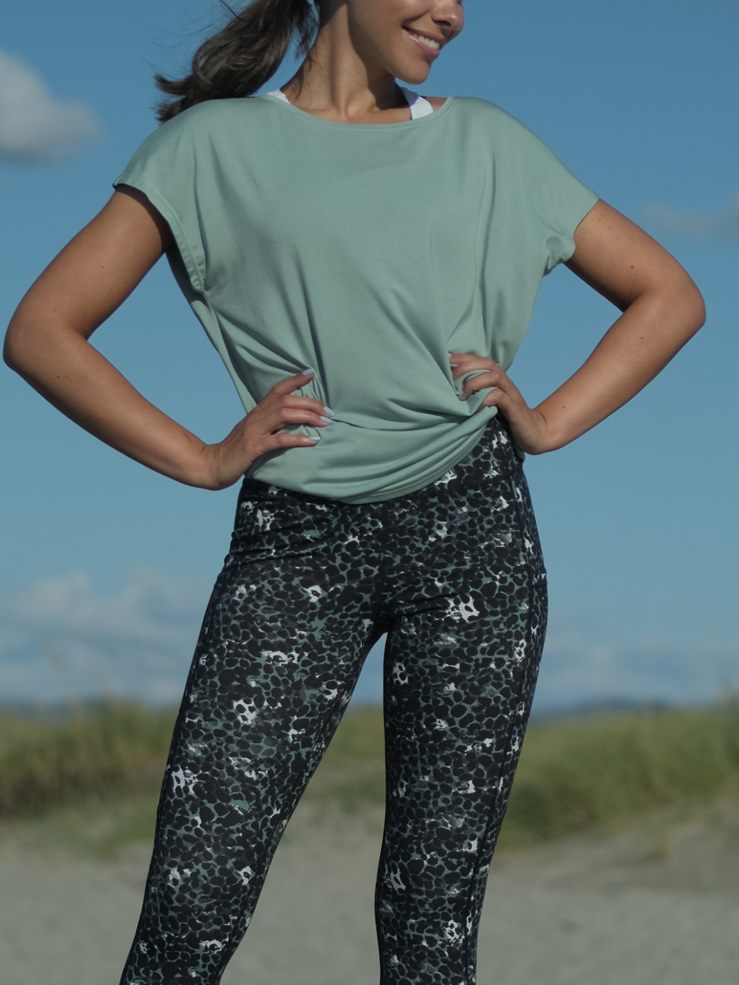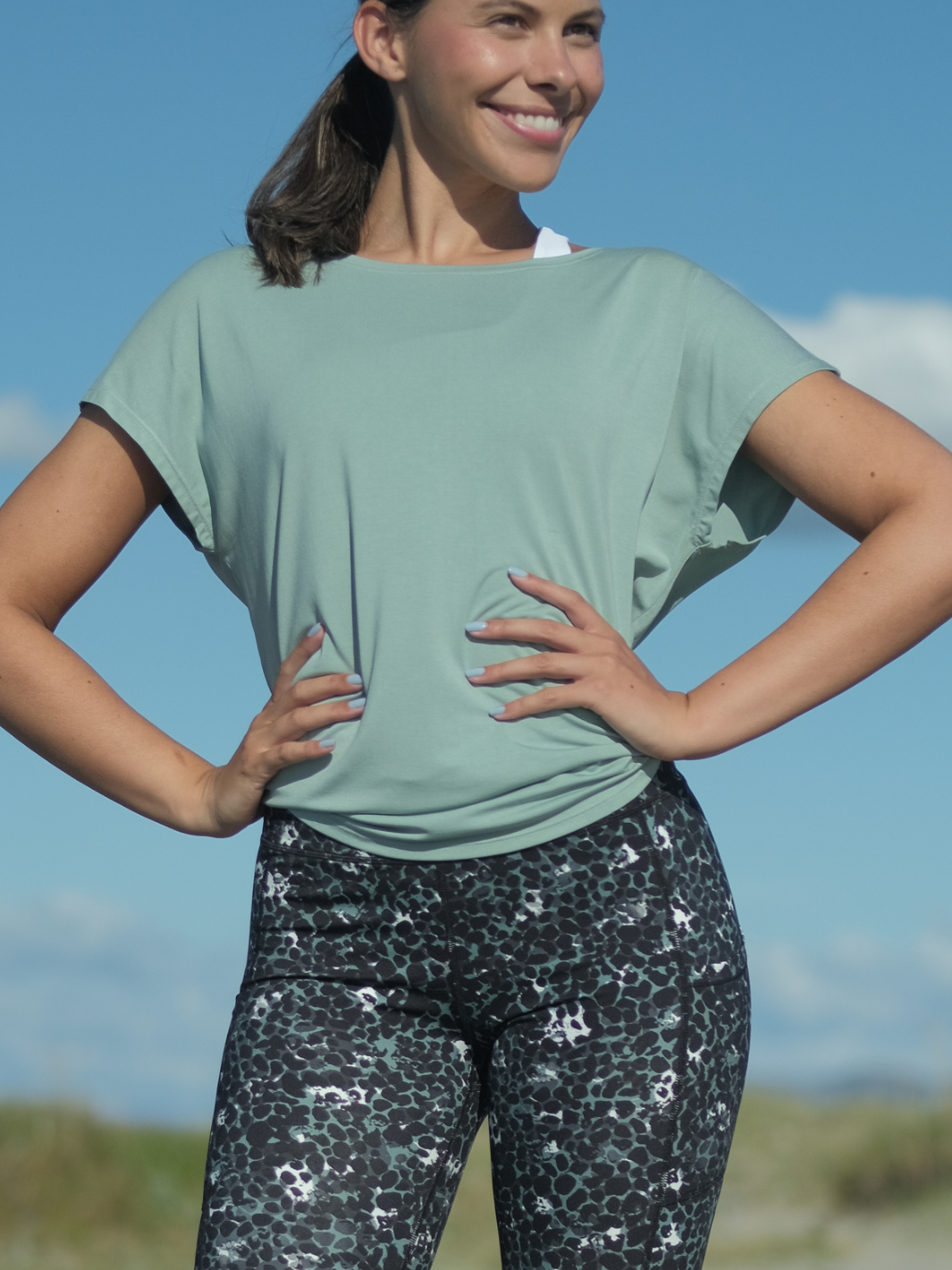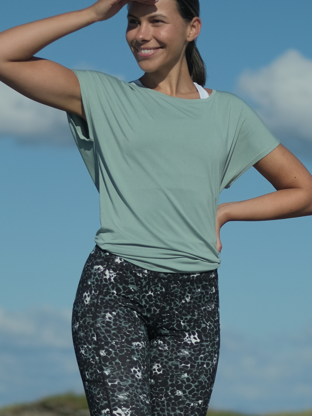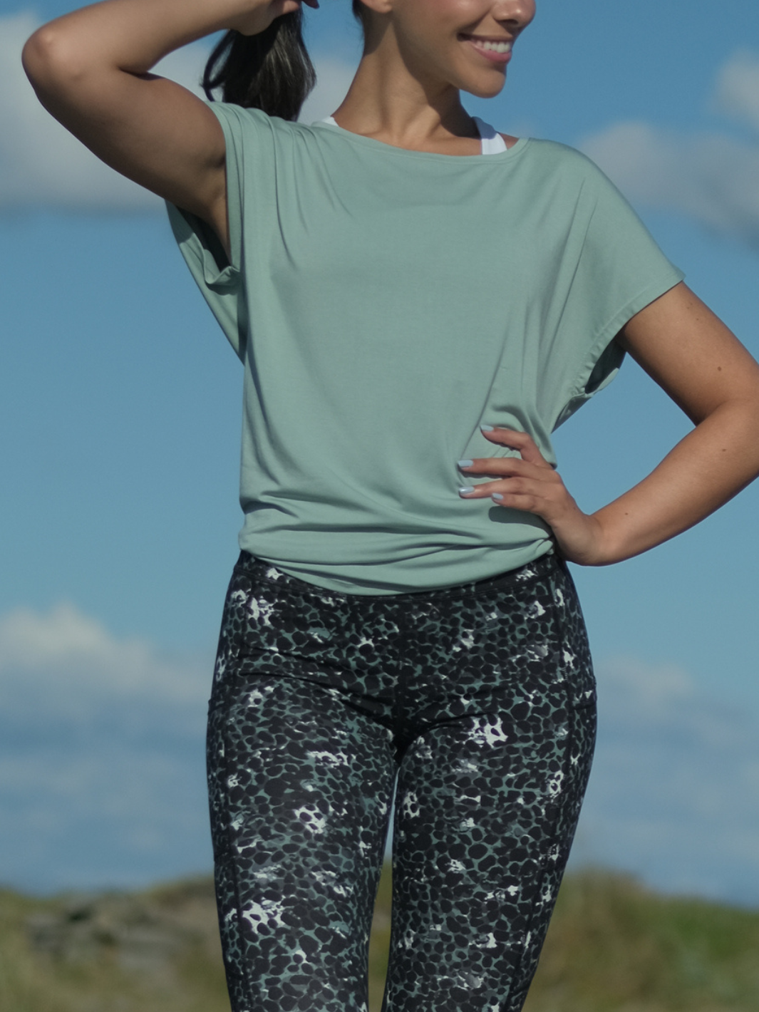 Skön t-shirt i lös passform men ändå smickrande i snittet. Tillverkad av naturmaterial + träningsmaterial, en mix av bland annat modal, som är väldigt skön att använda i varma miljöer, t.ex. vid träning. Lite längre bak än fram, med kort ärm som faller fint. Normal men något rymlig i storleken