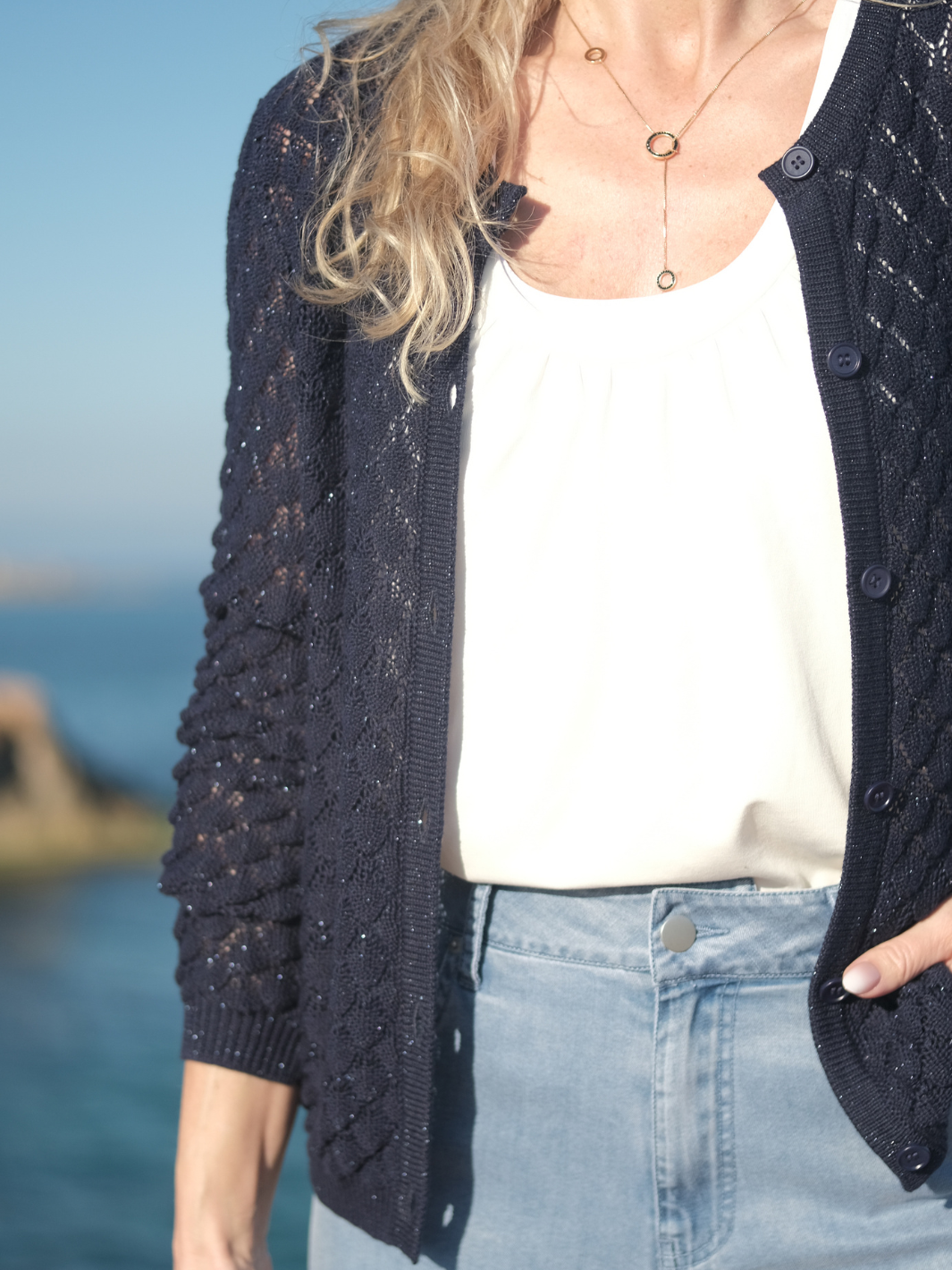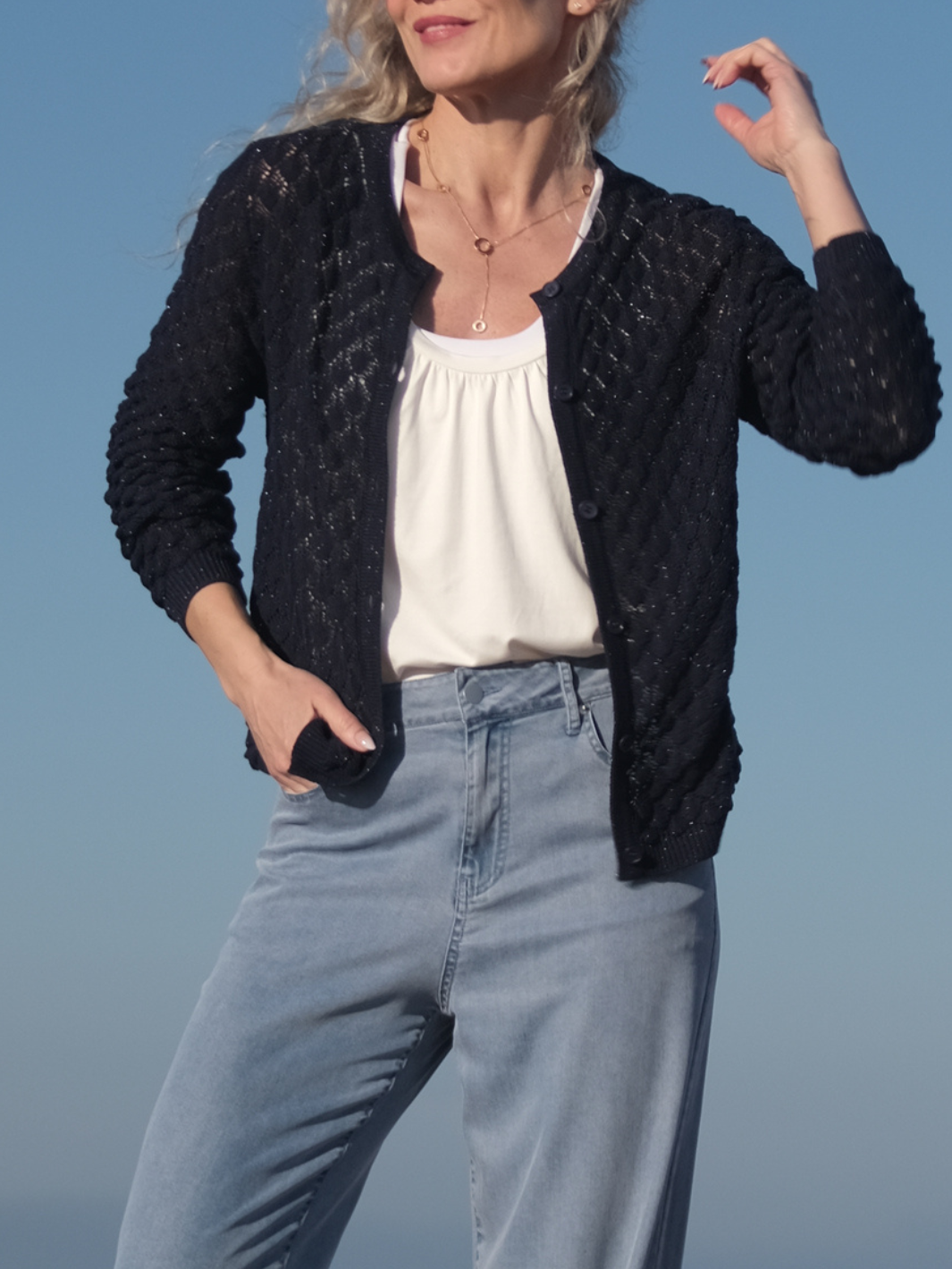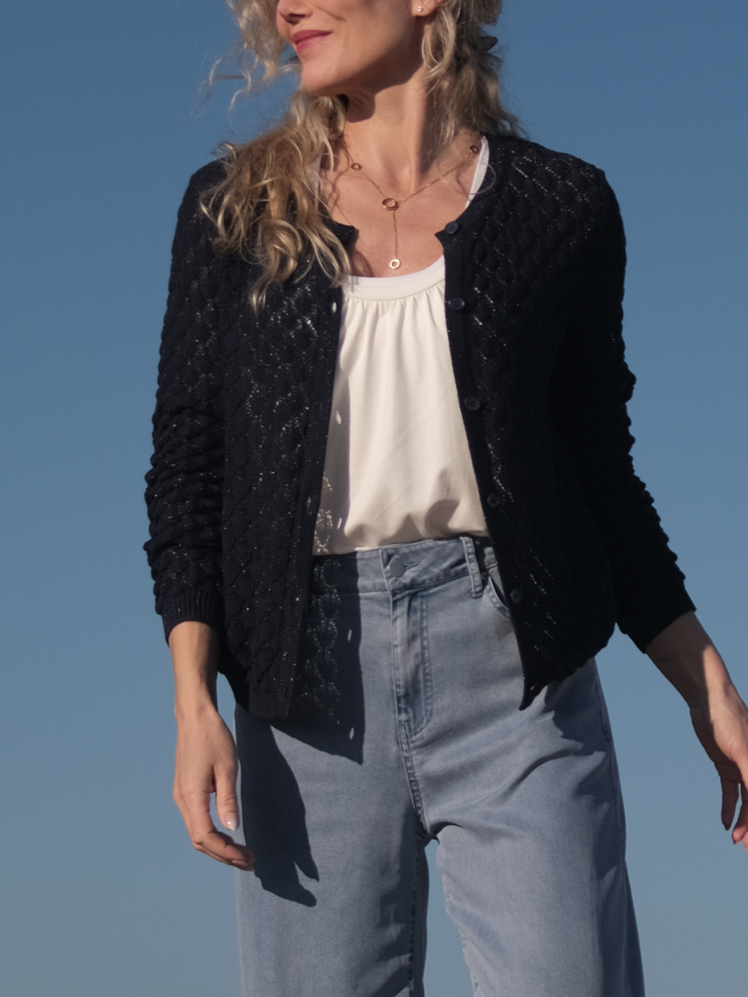 Unikt mönster som gör den extra elegant, i en härlig marinblå färg. En tunn guldtråd är invävd, vilket ger en subtil glittrande effekt. Denna marineblå och Ivory är något lättare i tråden och vävningen än Glow Cardigan Black och Desert, men alla är lika eleganta. Otroligt användbar både till vardags och finare tillfällen.