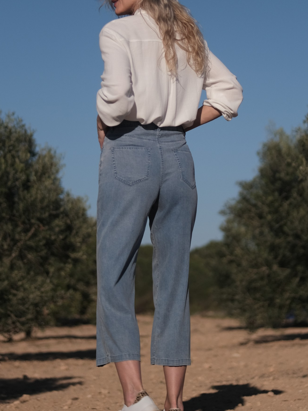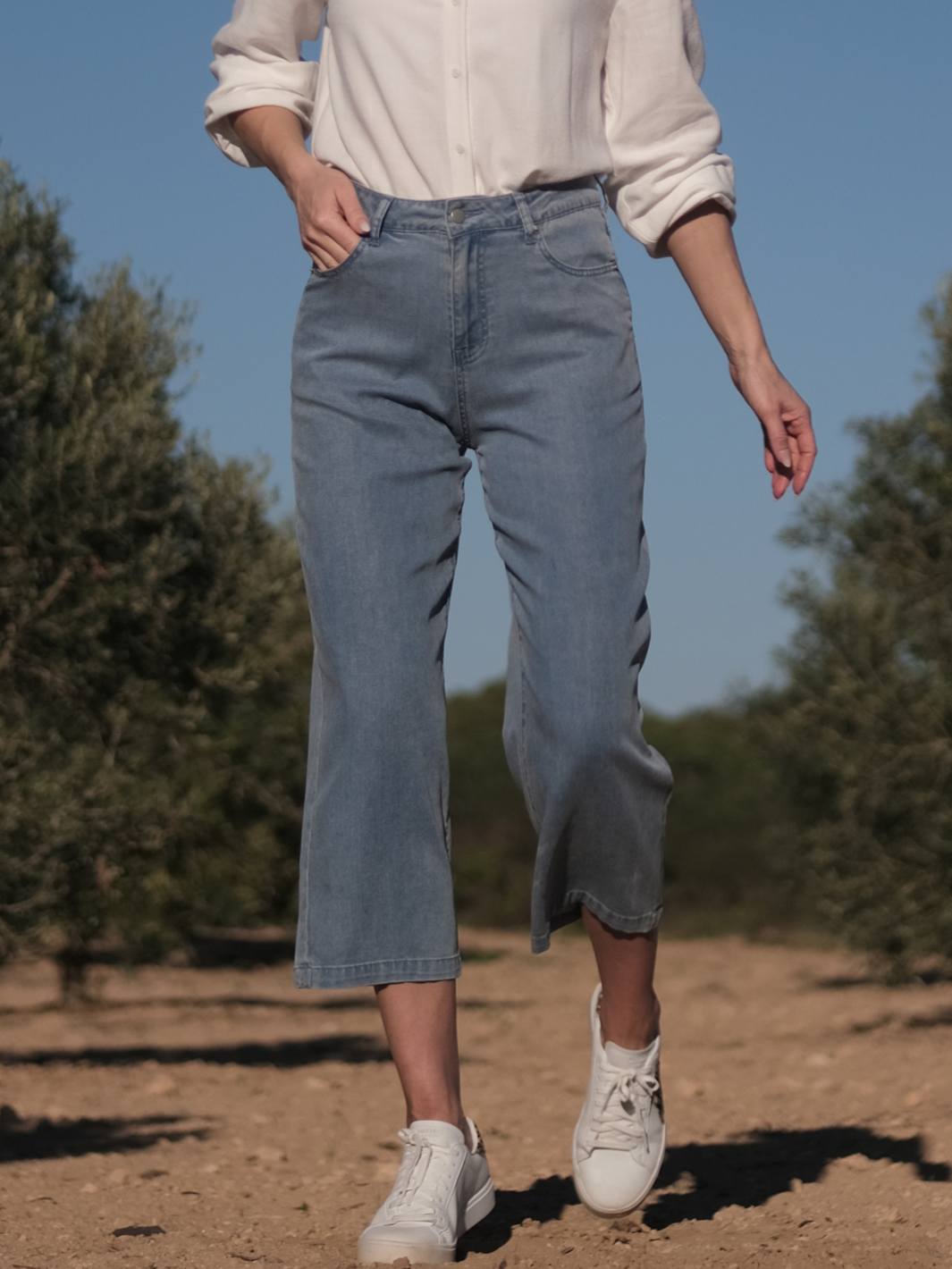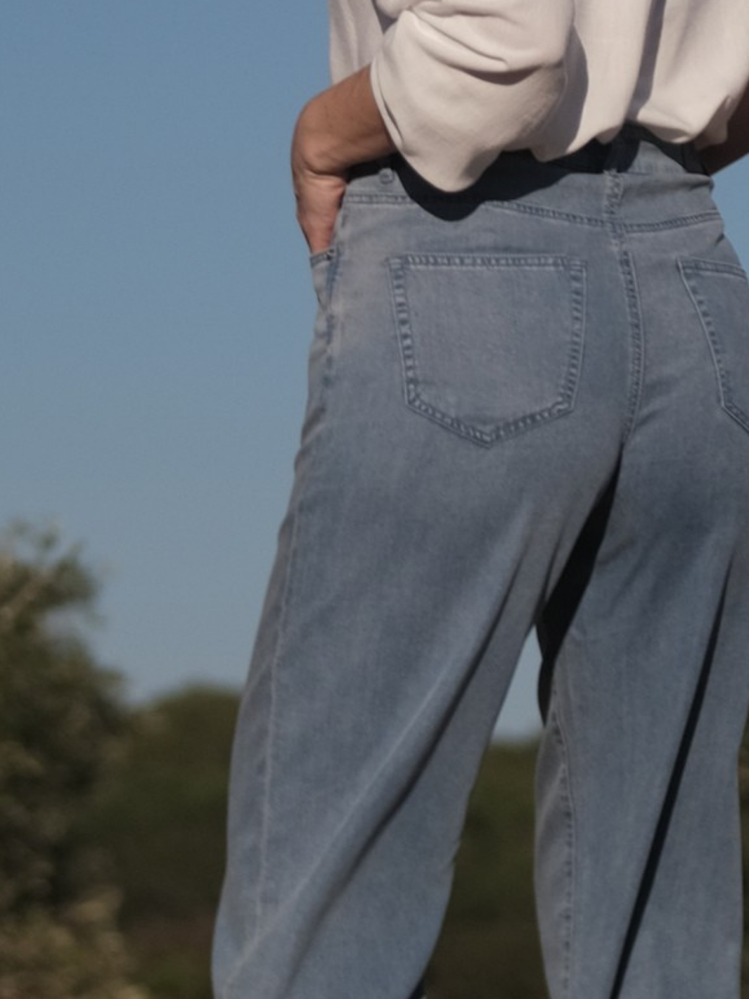 ✔️ Lätt och ventilerande lyocell ✔️ Jeansinspirerad finish i ljus tvätt ✔️ Vida ben i 7/8-längd ✔️ Perfekt blandning av komfort och stil