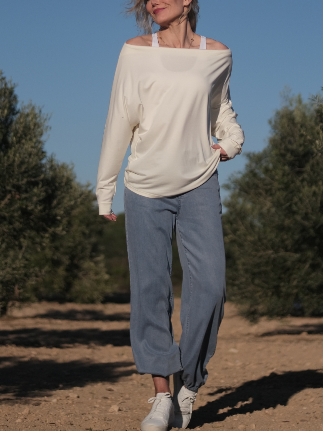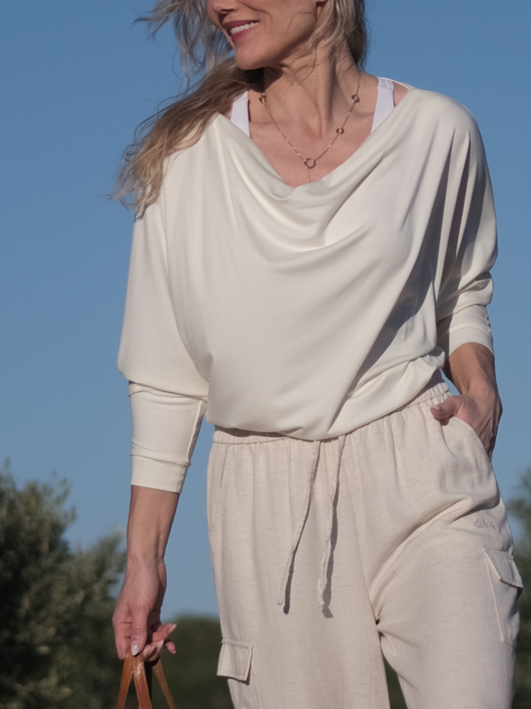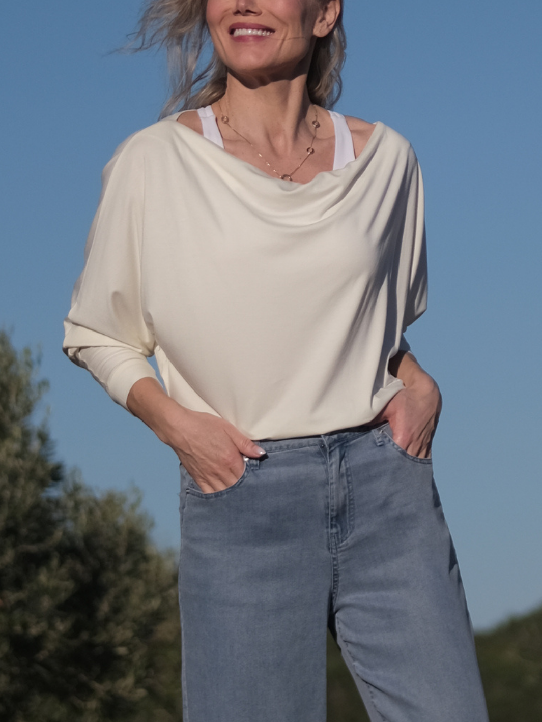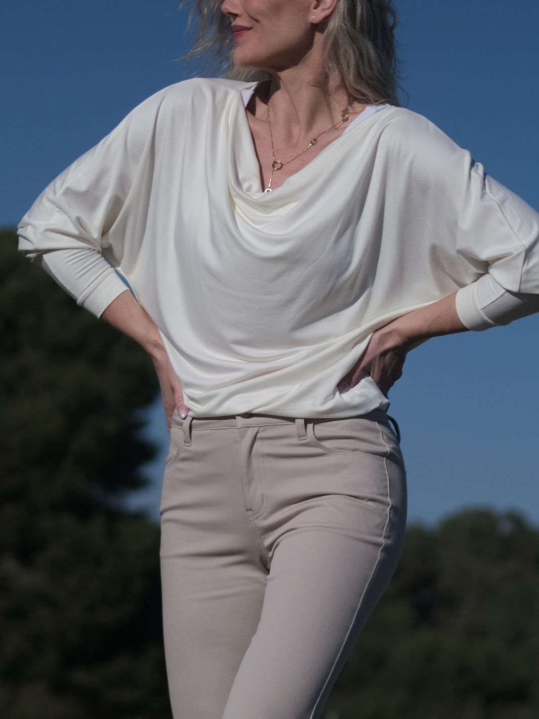 ✔️ Mjuk och ledig modell ✔️ Draperad halsringning med vackert fall ✔️ Något längre – perfekt för lager på lager ✔️ Enkel att styla upp eller ner